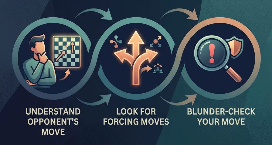 When you practice this process outside of games, especially while solving tactics, it becomes automatic. You stop consciously running through steps. You simply notice threats, forcing moves, and danger immediately.